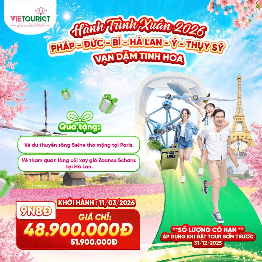 - Lễ 30/04 – Mùa hoa Tulip: 29/04/2026 – Giá: 57.900.000đ (Tặng vé tham quan vườn hoa keukenhof)